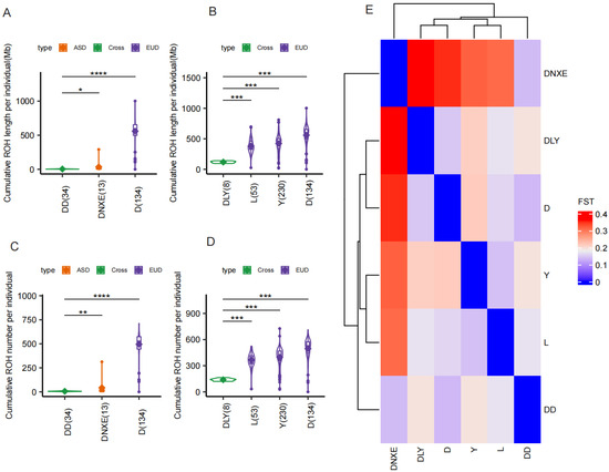 Two hybrid populations, Diannanxiaoer × Duroc (DD) and Duroc × Landrace × Yorkshire (DLY), were examined to assess the effects of crossbreeding. Both exhibited reduced ROH compared to their parental breeds. The DD population, resulting from an Asian–European cross, showed a significant reduction, suggesting that greater parental genetic divergence leads to substantial ROH attenuation (Figure 2A–D). Pairwise Fst values confirmed that the genetic distance between Diannanxiaoer and Duroc was significantly larger (Figure 2E).