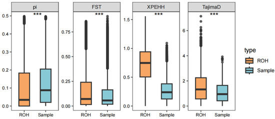 ROH were non-randomly distributed, with strong selection signals detected within ROH islands. SNPs within ROH island regions exhibited significantly lower π (pi) values and higher Tajima’s D, suggesting reduced genetic diversity and balancing selection. XP-EHH and Fst analyses further confirmed that European and Asian pigs have experienced distinct selection pressures in ROH regions (Figure 3).