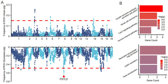 Pigs were domesticated across multiple regions of Eurasia between 9000 and 10,000 years ago, becoming one of the most important livestock species worldwide, supplying more than one-third of the animal protein consumed by humans [24]. Numerous studies have investigated the patterns of ROH in Asian and European pigs separately, exploring their associations with inbreeding and selection [25]. However, due to limitations in sample availability, data consistency, and differences in ROH-calling criteria, the global distribution patterns of ROH across major pig breeds remain largely unexplored. Here, we analyzed high-quality, whole-genome resequencing data from 1203 individuals representing 49 major pig breeds worldwide, revealing striking differences in ROH patterns between European and Asian pig populations. European pigs exhibited a higher number and total length of ROH compared to their Asian counterparts, and hybridization was found to reduce both the number and length of ROH. ROH regions showed strong signatures of selection, with ROH islands in European and Asian pigs enriched for distinct sets of functional genes, reflecting their divergent domestication histories and selection pressures. Notably, our study highlights FSTL5 as an example of how ROH segments contribute to selection responses by influencing key genes associated with growth and reproduction.