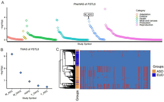 The FSTL5 gene suffers different selective pressures in European and Asian pig populations. (A) The point plot shows the association between FSTL5 gene and 298 complex traits. (B) The point plot shows significant association TWAS results between FSTL5 gene and traits in muscle tissue. (A,B) Data obtained from PigBiobank (http://pigbiobank.farmgtex.org, accessed on 11 January 2025). (C) Haplotype heat map of Asian and European pigs in the FSTL5 gene region (50.26–51.05 Mb).