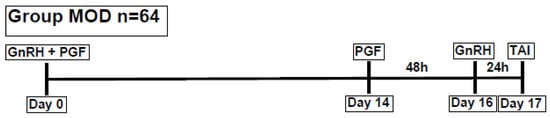 The therapy for the MOD group consisted of buserelin and cloprostenol on day 0 followed by cloprostenol on day 14 and buserelin on day 16. The therapy in the ROUT group consisted of other therapies (e.g., GnRH alone, hCG alone, or combined protocols with an intravaginal progesterone device (EAZI-BREED CIDR 1380®, Zoetis Schweiz GmbH, Delémont, Switzerland)). That group of animals (n = 81) served as the routinely treated group (ROUT).