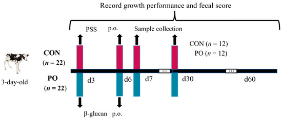 Calves were randomly allocated into two groups based on body weight: the CON (Control) group (n = 22) and the PO (Per Os) group (n = 22). Calves in the PO group were orally administered a yeast β-glucan solution (0.1 g/mL, 65 mg/kg body weight; purity: 90% on an air-dry basis, obtained from Nanjing Taixin Biotechnology Co., Ltd., Nanjing, China) at 3 and 6 days after birth. In contrast, calves in the CON group received an equivalent volume of physiological saline solution (PSS) at the same time points (Figure 1). Blood samples were randomly collected from 12 calves in each group by jugular venipuncture using BD Vacutainer tubes without anticoagulant (Franklin Lakes, NJ, USA) at 08:00 on days 7 and 30, followed by centrifuge at 3000× g for 15 min at 4 °C to isolate serum. Concurrently, fecal samples were obtained through rectal massage into 5 mL frozen tubes. Both serum and fecal samples were promptly frozen in liquid nitrogen and stored at −40 °C for subsequent analysis. At 30 days of age, samples of blood and rectal contents were collected from calves that had not previously had diarrhea.