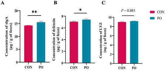 As shown in Figure 2, the levels of slgA and defensin in the feces of calves at 7 days in the PO group were significantly increased by feeding them yeast β-glucan (p < 0.01 or p < 0.05), and the LYZ concentration in the rectal feces of the PO group also tended to increase at 7 days of age (p = 0.085).