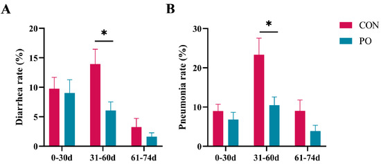 The effect of pre-stimulation with yeast β-glucan on the incidence of diarrhea (A) and pneumonia (B) in calves later (n = 22/group). All data are presented as mean ± SEM. SEM, standard error of the means. PO, Per Os group; CON, Control group. Asterisks indicate significant differences between the PO group and the CON group (* p < 0.05).