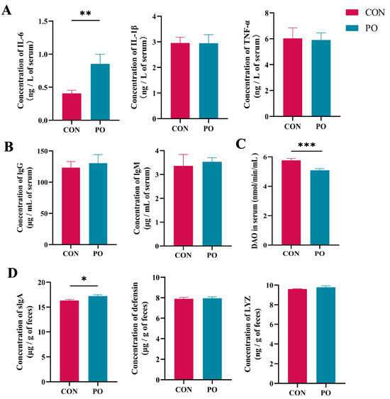 The detection results of 30-day-old calves showed that serum IL-6 levels in the PO group was significantly higher than that in the CON group (p < 0.01), while the serum DAO level in the PO group was significantly lower than that of the CON group (p < 0.001) (Figure 4A,C). The serum concentrations of IL-1β, TNF-α, IgG, and IgM are not significantly different from those in the CON group (Figure 4A,B). In addition, at 30 days of age, the slgA level in rectal feces of pre-stimulated calves was also significantly higher than that of the CON calves (p < 0.05), but there was no significant difference in fecal defensin and LYZ levels between the two groups (p > 0.05) (Figure 4D).