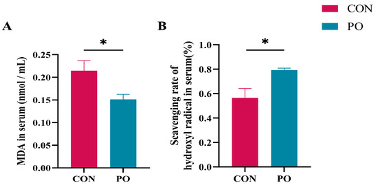 The effect of pre-stimulation with yeast β-glucans on oxidative stress level of calves at 30 days of age. (A) Levels of MDA in serum of calves (n = 12/group). (B) Levels of hydroxyl radical scavenging capacity in serum of calves. All data are presented as mean ± SEM. SEM, standard error of the means. PO, Per Os group; CON, Control group. Asterisks indicate significant differences between the PO group and the CON group (* p < 0.05).