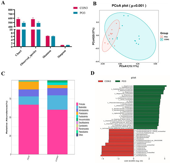 For α diversity, we used chao1 and observed species to reflect the microbial richness and the Shannon and Simpson index to reflect microbial diversity. As shown in Figure 6A, there was no significant difference in richness and diversity. Analysis of β diversity based on PCoA (principal coordinates analysis) of unweighted unifrac distance showed different clustering distributions (p = 0.001), as demonstrated in Figure 6B. Furthermore, the individual samples of the PO group were clustered together on the PCoA graph, while the individual samples of the CON group were dispersed. The relative abundance and composition of the top 10 at the phylum level are shown in Figure 6C. The fecal bacterial community was dominated by Firmicutes and Bacteroidota, followed by Actinobacteriota. For further assessment of the differences in fecal microbiota among the samples of the two groups, LDA (Linear Discriminant Analysis) was carried out for fecal microorganisms at different taxonomic levels with LDA > 3.0 (p < 0.05) as the critical value. Some genera that enriched in the CON group included Christensenellaceae_R_7_group, Pedobacter, Erysipelatoclostridium, Intestinimonas, and Fusobacterium. Eleven genera were significantly enriched in the PO group, consisting of Subdoligranulum, Megamonas, Enterococcus, Dorea, Clostridium_sensu_stricto_2, Muribaculaceae_unclassified, Allobaculum, Clostridium_sensu_stricto_13, Ligilactobacillus, Brevundimonas, and Lachnospiraceae_NK4A136_group (Figure 6D).