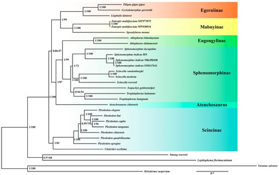 A phylogenetic tree was constructed using 13 mitochondrial PCGs from 27 species of Scincidae and 4 outgroup species using BI and ML methods. The numbers at the nodes represent the support values for those nodes, with the first number indicating the posterior probability from the BI tree and the second number representing the bootstrap value from the ML tree. Species grouped under the same color on the right side of the tree belong to the same taxonomic unit. The species Sp. indicus used in this study corresponds to Sphenomorphus indicus HN as depicted in the figure.