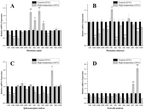 Mitochondrial-related mRNA expression in Plestiodon capito (A), Plestiodon chinensis (B), Sphenomorphus indicus (C), and Scincella modesta (D) under high-temperature stress. The expression levels of 13 mitochondrial PCGs under control conditions (25 °C) and high-temperature stress (34 °C). The x–axis indicates the individual genes, and the y-axis denotes the relative mRNA expression levels. Standard Error (SE) is used as the error bars. An asterisk “*” signifies a significant difference (p < 0.05), whereas “**” signifies a strong significant difference (p < 0.01). The expression levels were standardized relative to the β-actin gene as the internal control gene.