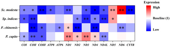 The transcript levels of mitochondrial PCGs in Sp. indicus, which primarily inhabits mid-to-high latitude regions, showed changes only in the ND5 gene and showed a strong significant upregulation to values of 1.96 ± 0.22 (Figure 3C). By contrast, six significantly downregulated mitochondrial PCGs were identified. Specifically, COI, COII, ND2, ND3, ND4, and ND4L expression decreased to values of 0.54 ± 0.06, 0.48 ± 0.05, 0.66 ± 0.04, 0.43 ± 0.02, 0.64 ± 0.05, and 0.43 ± 0.04, respectively. In Sc. modesta, which is found at lower latitude collection sites, the ND5 and ND6 genes showed strong significant upregulation, to values of 1.96 ± 0.14, and 3.57 ± 0.30, respectively (Figure 3D). By contrast, the transcript levels of other genes were significantly downregulated, including COI, COII, COIII, ATP8, ND1, ND3, ND4, ND4L, and CYTB genes, to values of 0.68 ± 0.05, 0.63 ± 0.04, 0.37 ± 0.06, 0.56 ± 0.06, 0.53 ± 0.04, 0.57 ± 0.06, 0.33 ± 0.05, 0.59 ± 0.07, and 0.32 ± 0.05, respectively. To enable direct visual comparison of expression levels, we constructed heatmaps and annotated statistically significant genes with asterisks to highlight their differential expression patterns (Figure 4).