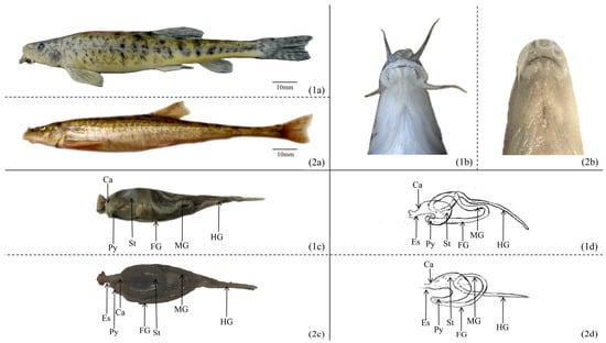 The morphology of the digestive system in T. strauchii and T. tenuis: (1a) morphology of T. strauchii; (2a) morphology of T. tenuis; (1b) mouth morphology of T. strauchii; (2b) mouth morphology of T. tenuis; (1c) digestive tract of T. strauchii; (2c) digestive tract of T. tenuis; (1d) diagram of the intestinal pattern of T. strauchii; (2d) diagram of the intestinal pattern of T. tenuis. Es: esophagus; Ca: cardia; St: stomach; Py: pylorus; FG: foregut; MG: midgut; HG: hindgut.
