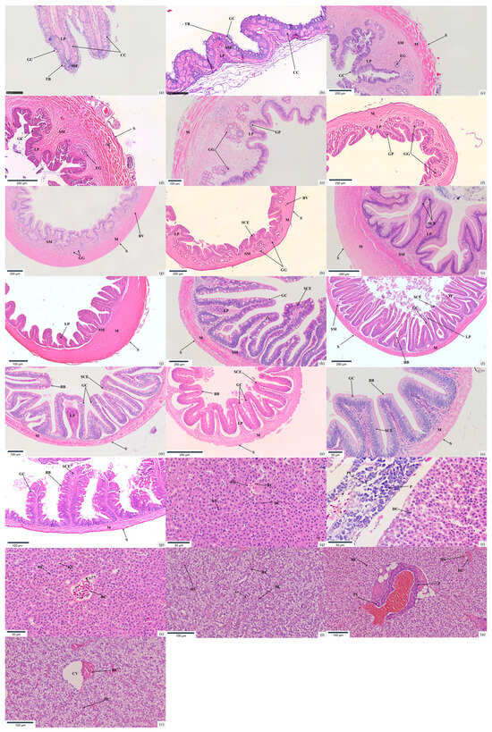 Tissue blocks of about (5 × 5 × 3) mm were excised from each segment of the digestive tract and from the liver and pancreas and immediately fixed in Bouin’s fixative (Beijing Bio-laboratech Co., Ltd., Beijing, China) for 24 h. After fixation, according to the conventional histological procedure, we dehydrated the tissue blocks through a graded alcohol series (Tianjin Zhiyuan Chemical Reagent Co., Ltd., Tianjin, China). They were successively immersed in 70%, 80%, 90%, 95%, and 100% alcohol solutions for 1–2 h each. Then, we cleared the dehydrated tissue blocks with xylene (Shanghai Macklin Biochemical Co., Ltd., Shanghai, China) for 30 min to 1 h to prevent the tissue from becoming brittle. After that, we embedded the tissue blocks in molten paraffin, ensuring proper positioning and alignment. We used a YD-202 microtome to cut sections with a thickness of 5–7 μm. The sections were stained with hematoxylin and eosin (HE) and observed under a microscope. We used image analysis software (Motic Images Plus 2.0) to measure histological parameters such as the height of mucosal folds and the thickness of the muscular layer in each segment of the digestive tract. On each section, we selected five random fields of view for each parameter and calculated the average value to ensure the accuracy and reliability of the data [17].
