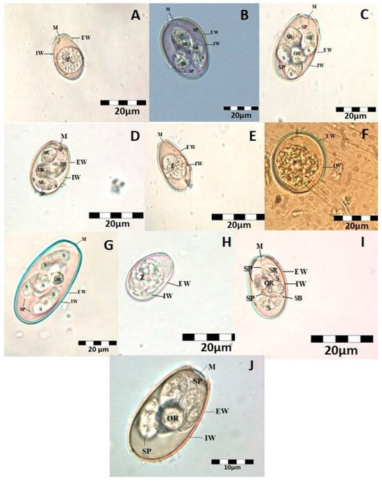 (A)-Eimeria intestinalis, (B)-Eimeria flavescens, (C)-Eimeria magna, (D)-Eimeria media, (E)-Eimeria piriformis, (F)-Eimeria exigua, (G)-Eimeria coecicola, (H)-Eimeria perforans, (I)-Eimeria vejdovskyi, and (J)-Eimeria stiedae (abbreviations: M-micropyl, EW-external wall, IW-inner wall, Z-zygote, S-sporozoite, SP-sporocyst (s), OR-oocyst residuum, SR-sporocyst residuum, and SB-stieda body).
