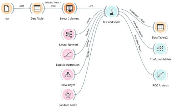 The machine learning approach was based on Orange software 3.38.1 [21]. This software is a Python-based tool for data mining and a machine learning suite, and it includes a set of widgets for data preprocessing, with features such as compute modeling, model comparison, and exploration methods [21,22,23].