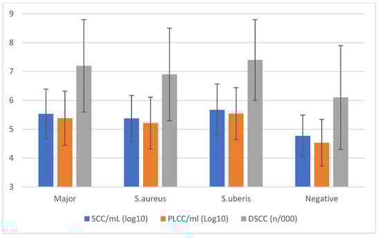 The comparison of cellular markers (Figure 2) based on the udder health status confirmed that MajP increased the mean values by nearly 1 log compared to negative samples.