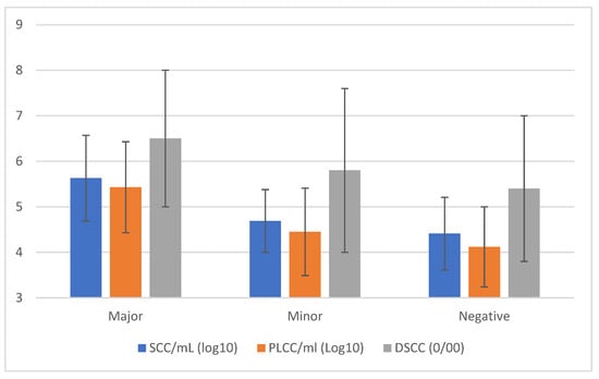 The results of SCC, DSCC, and PLCC (Figure 3) based on the outcome of the microbiological analysis confirm that the presence of MajP is associated with an inflammatory status with values higher than in quarter positives for minor pathogens or bacteriological negatives. The mean values for the three different cellular markers were very similar in these latter two cases.