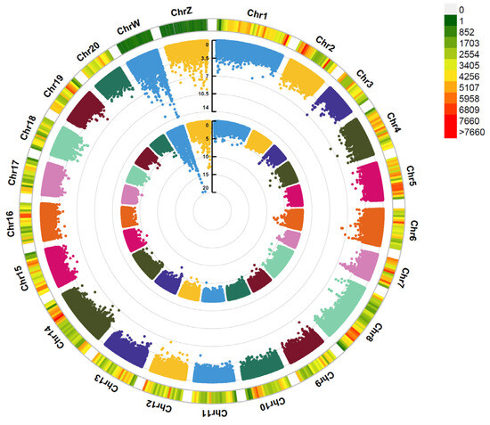 The Manhattan plot of the genome-wide association analysis (GWAS) for body weight and body length phenotypes in Cynoglossus semilaevis. Note: Figure 1 illustrates the distribution of SNPs across different chromosomes. The inner and outer circles represent the phenotypic associations for body weight and body length, respectively.