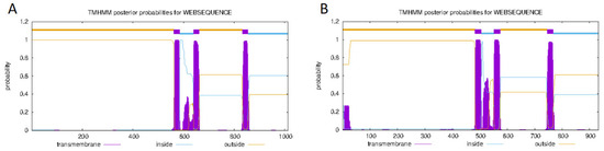 Analysis of transmembrane regions of the GluRD protein family of Cynoglossus semilaevis. Note: (A). Transmembrane region analysis of the Cynoglossus semilaevis GluD1 protein family; (B). Transmembrane region analysis of the Cynoglossus semilaevis GluD2protein family.