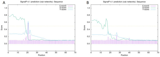 Signal peptide prediction and signal peptide shear site analysis of the GluD protein family of Cynoglossus semilaevis. Note: (A). Signal peptide prediction and signal peptide shear site analysis of the Cynoglossus semilaevis GluD1 protein family; (B). Signal peptide prediction and signal peptide shear site analysis of the Cynoglossus semilaevis GluD2 protein family.