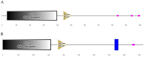 Structural domain analysis of the GluD protein family in Cynoglossus semilaevis. Note: (A). Structural domain analysis of Cynoglossus semilaevis GluD1 protein family; (B). Structural domain analysis of Cynoglossus semilaevis GluD2 protein family.