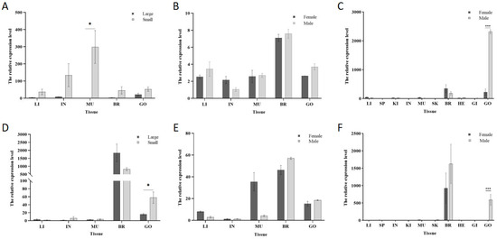 Analysis of the expression patterns of genes in the grid gene family in Cynoglossus semilaevis. Note: (A). Expression of grid1 in each tissue in different sizes of the same sex; (B). Expression of grid1 in each tissue in different sizes of the same sex; (C). Expression of grid1 in whole tissues of different sizes of the male and female; (D). Expression of grid2 in tissues in different sizes of the same sex; (E). Expression of grid2 in tissues in different sizes of the same sex; (F). Expression of grid2 in whole tissues of different sizes of the male and female. Expression in whole tissues of different sizes. * indicates significant difference (p < 0.05). *** indicates significant difference (p < 0.001).