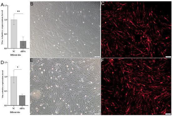 Expression changes of the grid gene family in Cynoglossus semilaevis after knockdown. Note: (A). Comparison of expression of NC after grid1 knockdown with negative control; (B). Corresponding light microscopy images of (C); (C). Red fluorescence signal after transfection of Cynoglossus semilaevis testicular cells with Cy3-siRNA for 24 h when knocking down grid1. (D). Comparison of expression of NC after grid2 knockdown with negative control; (E). Corresponding light microscopy images of (F); (F). Red fluorescence signal after transfection of Cynoglossus semilaevis testicular cells for 24 h when knocking down grid2 with Cy3-siRNA transfection of Cynoglossus semilaevis testicular cells for 24 h after red fluorescence signal. * indicates significant difference (p < 0.05), ** indicates significant difference (p < 0.01).