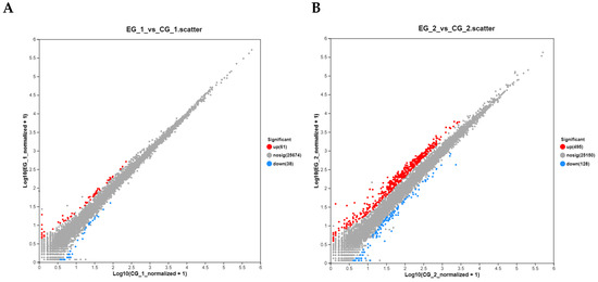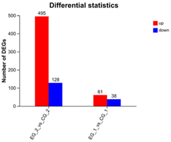 In the experimental group treated with grid1-siRNA and its control group (grid1-NC), 99 differentially expressed genes (DEGs) were identified using the DEGseq software (https://bioconductor.org/packages/DEGseq/ accessed on 20 October 2024) with thresholds set at p-value < 0.05 and |log2 fold change| ≥ 1. Among these DEGs, 61 were up-regulated and 38 was down-regulated. Meanwhile, in the grid2-siRNA experimental group and its control group (grid2-NC), 623 DEGs were identified, with 495 up-regulated and 128 down-regulated (Figure 8). Clustering analysis results indicated a clear distinction between the experimental and control groups for both grid1 and grid2, suggesting well-clustered samples and the feasibility of proceeding with further experiments (Figure 9).