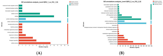 GO function annotation and enrichment analyses were conducted for the grid1-siRNA and grid1-NC groups, as well as for the grid2-siRNA and grid2-NC groups, to explore the potential functions of DEGs after interfering with grid1 and grid2 in Cynoglossus semilaevis testicular cells. GO functional annotation after grid1 knockdown showed that DEGs were primarily involved in biological processes such as catalytic activity, binding, protein-containing complexes, cellular anatomical entities, response to stimuli, metabolic processes, bioregulation, and cellular processes (Figure 10A). In contrast, GO annotation after grid2 knockdown revealed that DEGs were mainly associated with cellular processes, metabolic processes, biological regulation, response to stimuli, developmental processes, multicellular organismal processes, and inter-organismal biological processes (Figure 10B).