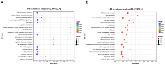 Grid gene family GO function enrichment bubble map. Note: (A). Grid2 GO functional enrichment bubble chart; (B). Grid1 GO functional enrichment bubble chart. The horizontal axis is the enrichment multiplicity, and the size of the dots represents the number of genes enriched for each function; the larger the dot, the greater the number of genes enriched above this GO entry, and the redder the dot, the more significant the corrected p-value.