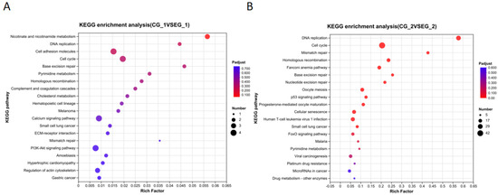 The KEGG signaling pathway enrichment analysis of differentially expressed genes (DEGs) in the grid1-siRNA experimental group compared to the grid1-NC group indicated that numerous DEGs were notably enriched in 20 signaling pathways, including DNA replication, pyrimidine metabolism, purine metabolism, and cell cycle (Figure 12A). Similarly, the KEGG analysis for DEGs in the grid2-siRNA experimental group versus the grid2-NC group revealed significant enrichment in 20 signaling pathways, such as DNA replication, cell cycle, homologous recombination, mismatch repair, base excision repair, nucleotide excision repair, and cellular aging (Figure 12B).
