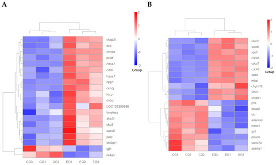 Clustering heatmap of downstream growth-related gene expression changes after disruption of the grid gene family expression. Note: (A). Grid1 clustered heat map of downstream growth-related gene expression changes after gene expression disruption; (B). Grid2 clustered heat map of downstream growth-related gene expression changes after gene expression disruption.