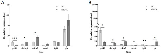 qPCR validation of downstream growth-related genes. Note: (A). Grid1 gene expression changes; (B). Grid2 gene expression changes. * indicates significant difference (p < 0.05), ** indicates significant difference (p < 0.01), *** indicates significant difference (p < 0.001).