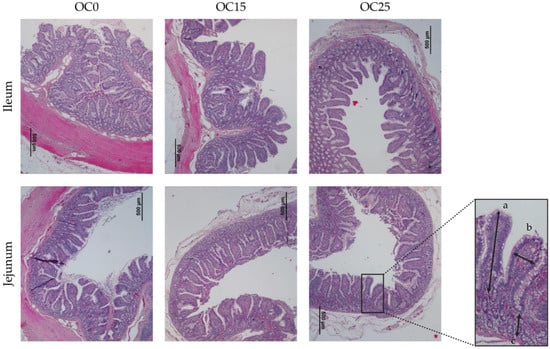 Six representative images of histomorphometric analyses of intestinal villi in two segments of the small intestine (jejunum and ileum) from animals subjected to the three experimental diets: OC0, OC15, and OC25. (a) Villi height (µm); (b) villi width (µm); (c) crypt depth (µm).