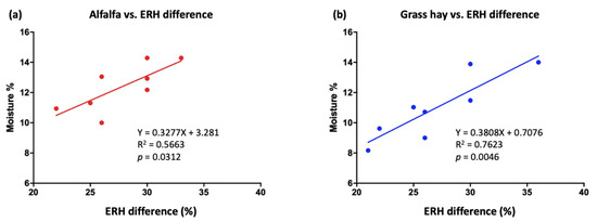 Association between (a) alfalfa (red line) and (b) grass hay (blue line, 1:1 mixture of oat hay and Timothy hay) moisture contents (%) and environmental relative humidity (ERH) differences (%) within a day (each dot represents the average of 10 bale samples). The hay moisture content was analyzed using the PROC MIXED procedure for repeated measures. The associations between ERH and hay moisture content were analyzed using regression analysis within the MIXED procedure of SAS 9.4. Treatment comparisons were performed using the Tukey adjustment for multiple comparisons. p values > 0.05 and ≤0.10 were considered to indicate a trend, whereas p values < 0.05 were considered to indicate significance.