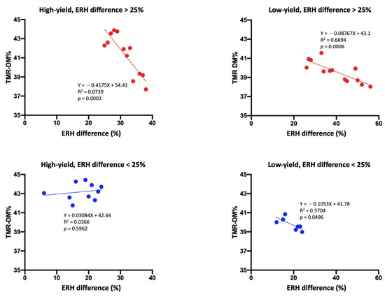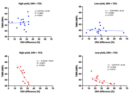Figure 2 illustrates that when ERH > 75%, no significant association was found between ERH difference and TMR DM in the high-yield (R2 = 0.08, p = 0.69) and low-yield groups (R2 = 0.008, p = 0.74). However, when ERH < 75%, a negative association was observed in both high-yield (R2 = 0.68, p = 0.001) and low-yield (R2 = 0.39, p = 0.01) groups.