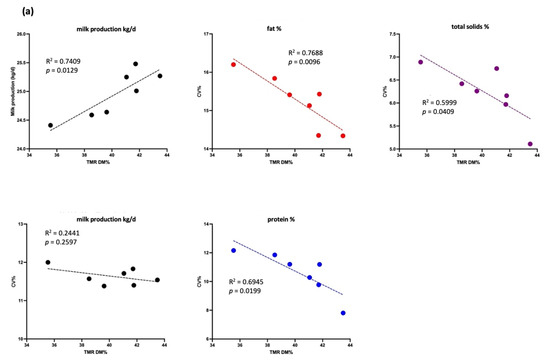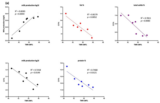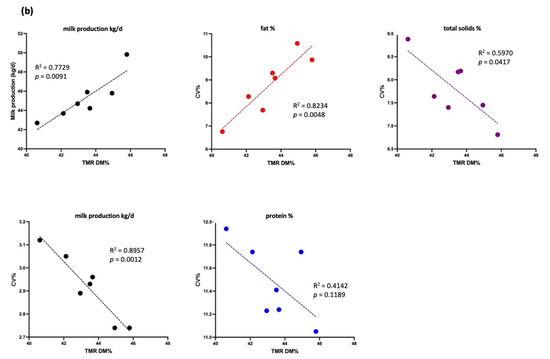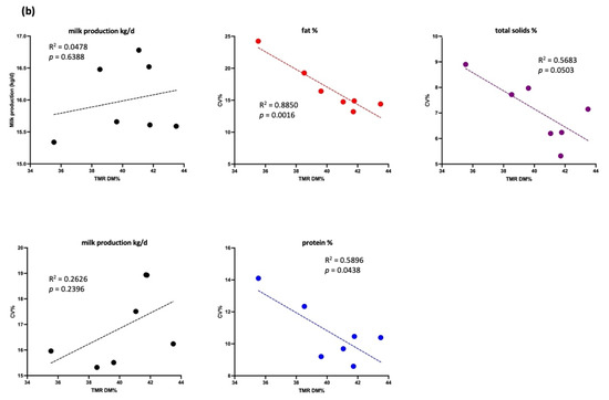 Association between milk production (kg/d) and total mixed ration (TMR) dry matter (DM, %), as well as association between the coefficient of variation (CV, %) of milk production (kg/d, black lines), fat (%, red lines), total solids (%, purple lines), and proteins (%, blue lines) and TMR DM (%) in the low-yield group (each dot represents the average milk production and composition in CV% of experimental cows). (a) Data for cows producing 20–30 kg/d and (b) data for cows producing < 20 kg/d.