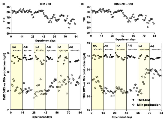 Effect of the temperature–humidity index (THI) and total mixed ration (TMR) dry matter (DM) adjustment on milk production during the experimental period (Experiment 3). (a) Cows with days in milk (DIM) less than 90; (b) cows with DIM between 90 and 150. NA: non-adjusted; Adj: adjusted.