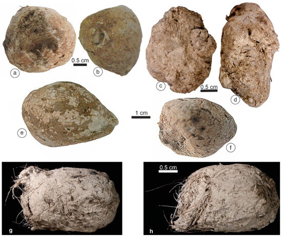 The morphology and color of Hyanea coprolites were similar to those of Crocuta (Figure 3). Typically, the outer surface of the samples was hard, and they were friable and exhibited numerous hairs (Figure 3g,h). The maximal size was 28.5 mm (Table 1).