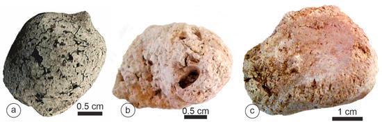 Parahyaena coprolites had an irregular outer surface (Figure 4) and reached a maximum size of 20–25 mm (Table 1). Despite their porous appearance, with both small and large holes (Figure 4), these coprolites were remarkably hard.