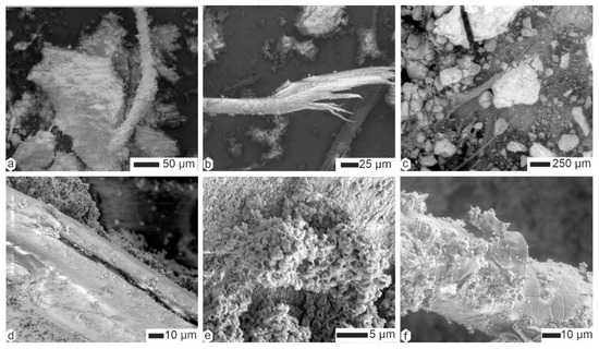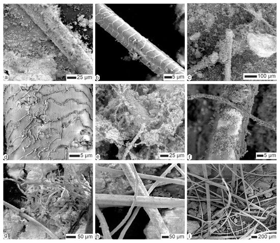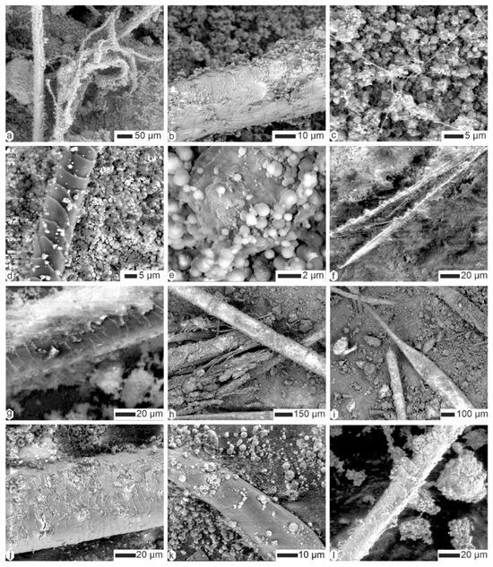 Coprolites of Crocuta consisted of organic fibers embedded within a matrix of tiny mineral particles (Figure 6 and Figure 7). The diverse diameters and surface structures of these fibers indicated their varied origins. Some fibers showed a scaly surface, and so were assigned to hairs, whereas others were branched and folded (Figure 6a). Depending on the sample, these fibers were often covered with small round particles, usually assigned to bacteria (Figure 6a,b,d,e). Very thin filaments also existed, the diameter of which being smaller than 1 µm (Figure 6c). Some remains were composed of elongated aligned elements, similar to dry vegetal structures (Figure 6f,i and Figure 7a–d), whereas others definitely had the appearance of hair (Figure 7f).