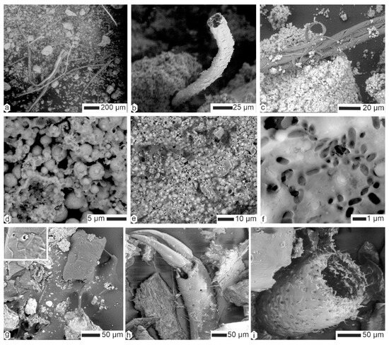 Hairs were also present in the coprolites of Hyaena (Figure 8a–d); they could be taxonomically determined (i.e., morphology of scales, ratio of medulla to cortex) [42,43]). In a given sample, they were often covered with small, round particles, often described as bacteria (Figure 8c–d). When these “bacteria” obscured the surface of the filaments, it became difficult to distinguish between hairs and plant sprigs (Figure 8e,g,h). Felts of fine filaments of unknown origin also occured (Figure 8i). The diameter of the preserved hairs varied.