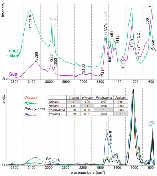 FTIR ATR average spectra of mammal bones (a) and Hyaenid coprolites (b). Hyaenid and Sus bone spectra were compared to the standards library of the Kimmel Center for Archaeological Science, available online at http://www.weizmann.ac.il/kimmel-arch/infrared-spectra-library (accessed on 11 October 2024). Insert: linear correlation coefficients.