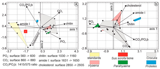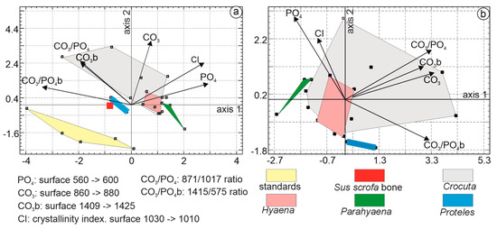 The multivariate analysis employed principal component analysis. The first principal axis accounted for 38.7% of the total variance, followed by axis 2 at 32.94% and axis 3 at 11.64%. The first principal component was characterized by higher CO3PO4b, PO4, and Cl eigenvalues. In the second principal component, samples were characterized by higher CO3, CO3PO4, and CO3b values. Organic standards, Sus bone, Proteles, and Parahyaena were clearly differentiated (Figure 11a). The Hyaena domain was encompassed within the Crocuta domain.