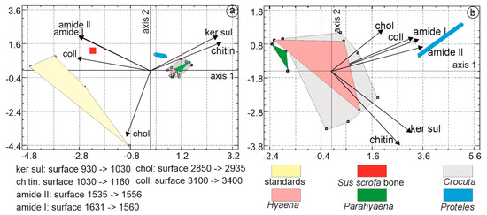 In the PCA dedicated to organic components, the first principal axis accounted for 64.5% of the total variance, followed by axis 2 at 19% and axis 3 at 12.2%. The first principal component was characterized by higher eigenvalues associated with collagen, amide I, and amide II. The second principal component differentiated samples based on higher levels of cholesterol, keratin sulfate, and amide I. Organic standards, such as Sus bone and Proteles, were readily identifiable. Notably, Sus bone was positioned close to collagen. The domains of Hyaena, Crocuta, and Parahyaena overlapped (Figure 12a).