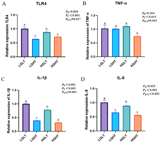 The effects of RPG and RPT on the levels of inflammatory factors in yak liver are shown in Figure 1. The relative mRNA expression of TLR4 and IL-8 was lower in the LGHT and HGHT treatment groups than in the LGLT and HGLT groups (p < 0.05). The TNF-α expression was lower in the HGHT treatment group than in the other groups (p = 0.042). The IL-1β expression was lower in the LGHT and HGHT groups than in the LGLT and HGLT groups (p = 0.001).