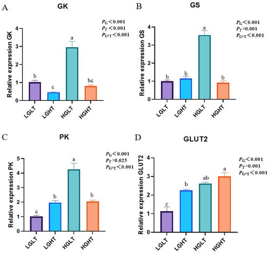 Effects of RPG and RPT levels on hepatic glucose metabolism in yaks (n = 6). “G” represents RPG; “T” represents RPT; and “G*T” represents the interaction effect of RPG and RPT. (A) The relative expression of GK in the liver. (B) The relative expression of GS in the liver. (C) The relative expression of PK in the liver. (D) The relative expression of GLUT2 in the liver. Note: Values are mean ± SEM; different letters indicate significant differences (p < 0.05). Different colors represent different treatment groups.