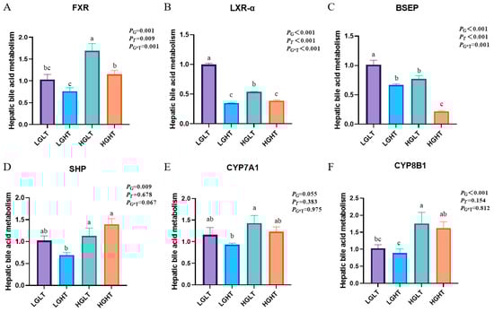 Effects of RPG and RPT levels on hepatic bile acid metabolism in yaks (n = 6). “G” represents RPG; “T” represents RPT; and “G*T” represents the interaction effect of RPG and RPT. (A) The relative expression of FXR in the liver. (B) The relative expression of LXR-α in the liver. (C) The relative expression of BSEP in the liver. (D) The relative expression of SHP in the liver. (E) The relative expression of CYP7A1 in the liver. (F) The relative expression of CYP8B1 in the liver. Note: Values are mean ± SEM; different letters indicate significant differences (p < 0.05). Different colors represent different treatment groups.