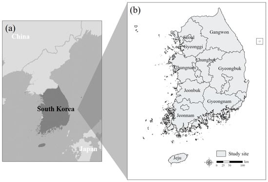 (a) Location of the study site, situated between China in the west and Japan in the east, and (b) provincial areas in the Republic of Korea.