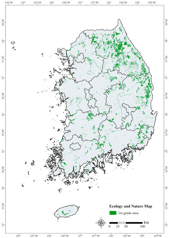The ENM is a 1:25,000 scale map of South Korea constructed based on the results of 14 national ecosystem surveys. It classifies natural environments such as mountains, rivers, and inland wetlands by region according to their ecological value, naturalness, and landscape significance [55]. The four main factors that determine the ENM classification are vegetation, endangered wildlife, wetlands, and topography. The ENM categorizes regions into 1st-grade areas, within which the conservation and restoration of the natural environment are prioritized; 2nd-grade areas, which serve as buffer zones and are subject to restricted use; and 3rd-grade areas, within which development is permitted. Separate management areas are also designated for specific protection purposes [55]. The 1st-grade areas identified on the ENM are important for ecological conservation and require strict protection and restoration efforts. They are considered habitats for endangered wildlife (Classes I or II) or contain high-value vegetation (Vegetation Conservation Grades I or II) [45]. While the ENM serves as a vital indicator for evaluating ecosystem conservation and environmental impact assessment in development planning, the proportion of 1st-grade land remains relatively low compared to its ecological significance [56].