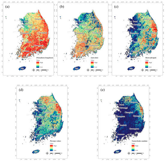 Potential distribution of five mammals designated as endangered in South Korea: (a) Prionailurus bengalensis, (b) Lutra lutra, (c) Martes flavigula, (d) Pteromys volans, and (e) Naemorhedus caudatus. Red shading represents a high probability of species occurrence.